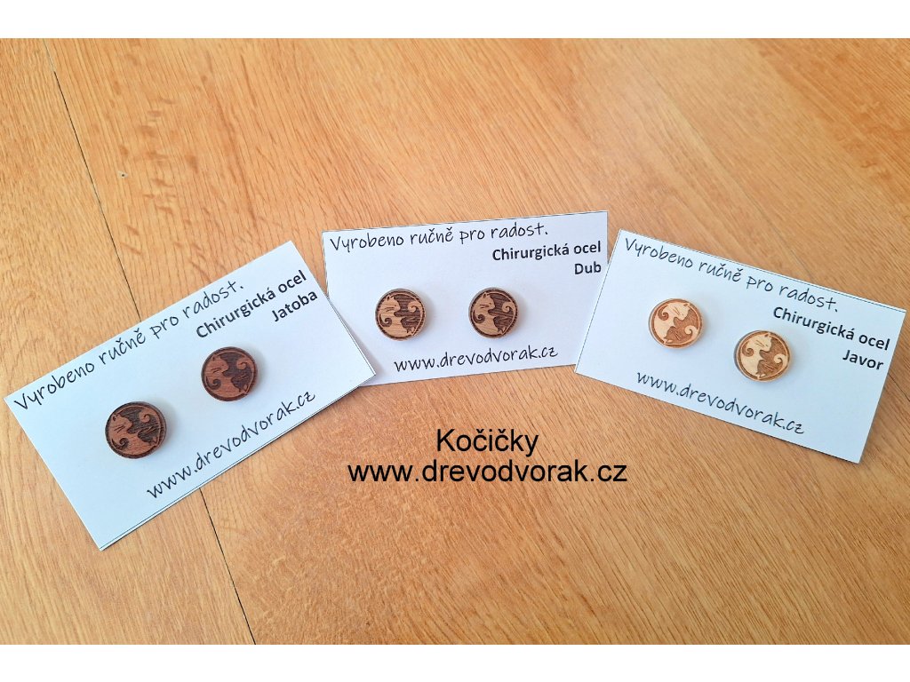 Dřevěné náušnice jsou vyrobené z poctivého kousku dřeva - žádná překližka, ale výběrové dřevo o síle 3 - 4mm. Na výběr máte nejsvětlejší americký javor, střední dub a nebo tmavou jatobu (brazilskou třešeň).