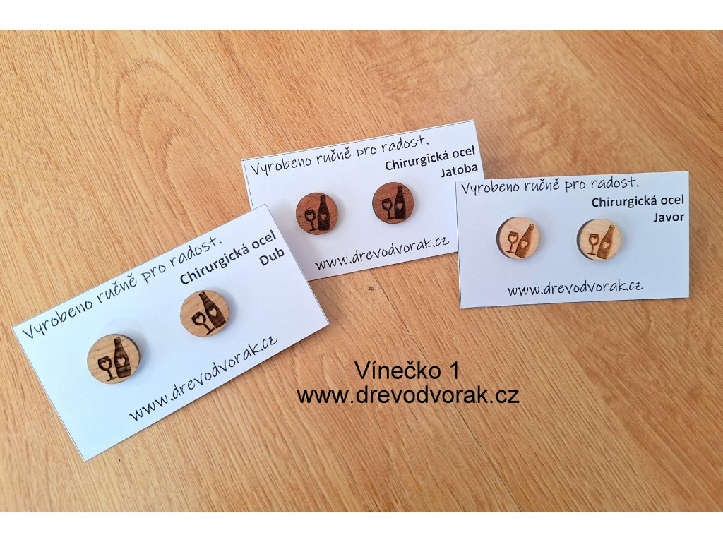Dřevěné náušnice jsou vyrobené z poctivého kousku dřeva - žádná překližka, ale výběrové dřevo o síle 3 - 4mm. Na výběr máte nejsvětlejší americký javor, střední dub a nebo tmavou jatobu (brazilskou třešeň).