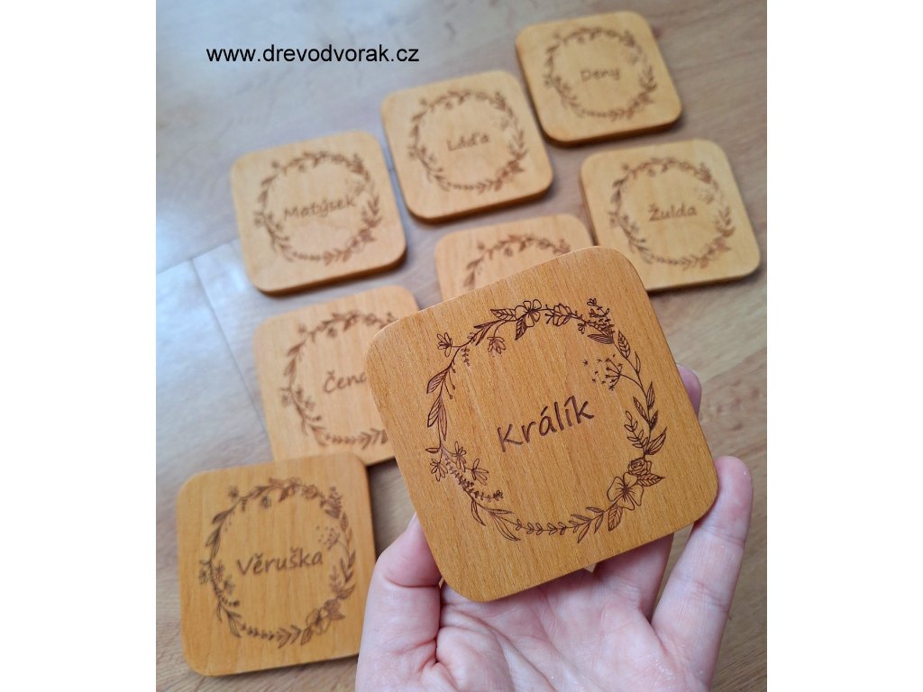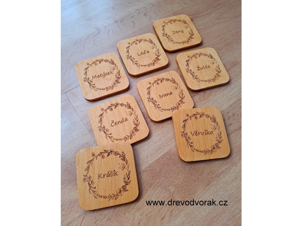 Nabízíme kulaté podtácky o průměru 8 cm a hranaté podtácky o rozměru 9 x 9 cm. Text je gravírovaný laserem. Každý podtácek pečlivě ručně vyřezáváme, brousíme a natíráme. Podtácky dodáváme s lazurou v odstínu dub.