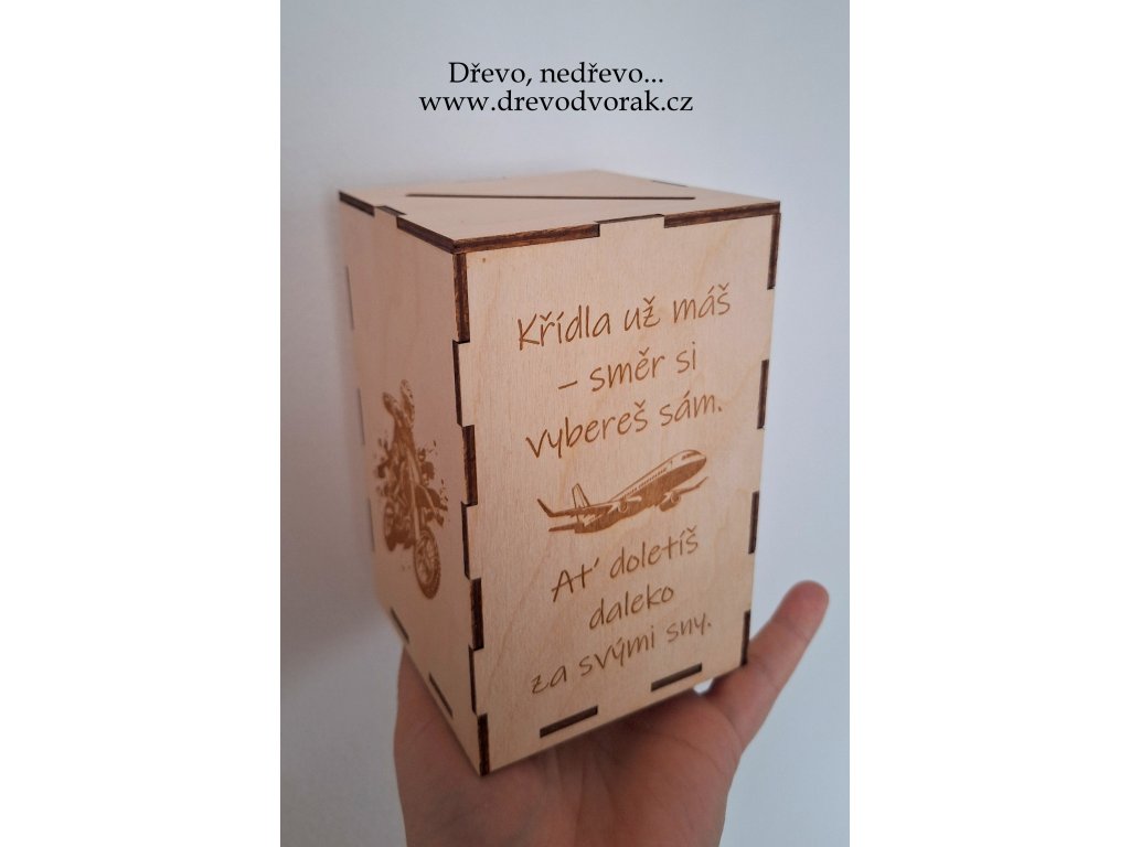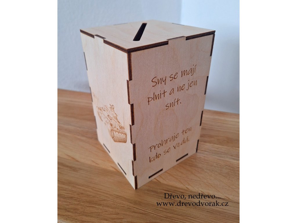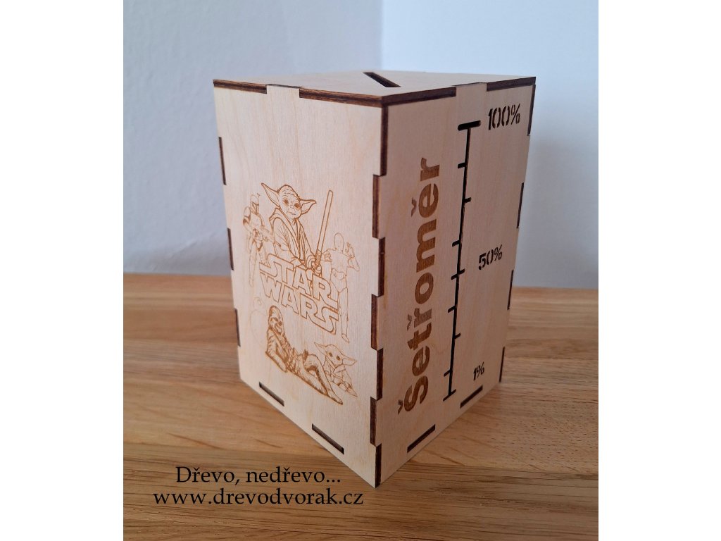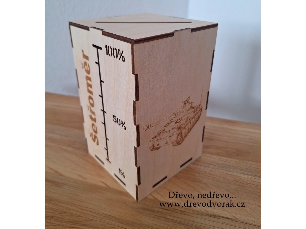 Originální dřevěná pokladnička "Šetřoměř" s možností vlastního nápisu.