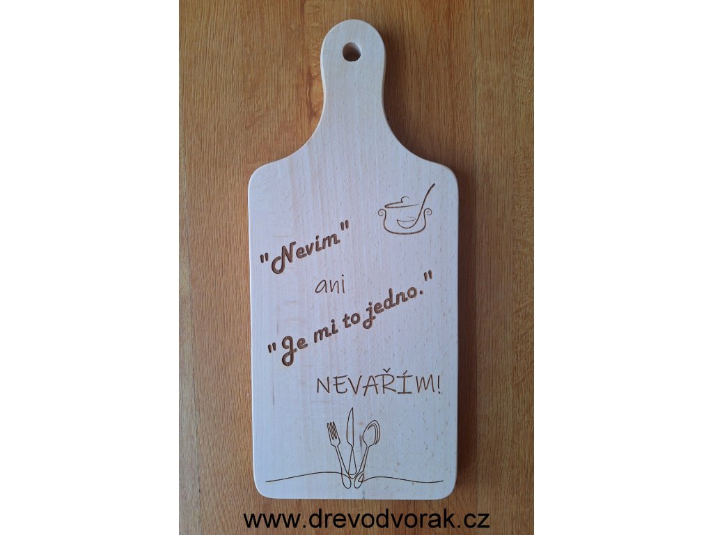 Prkénko z bukového dřeva s nápisem "Nevím" ani "Je mi to jedno" nevařím!, který zaručeně pobaví.