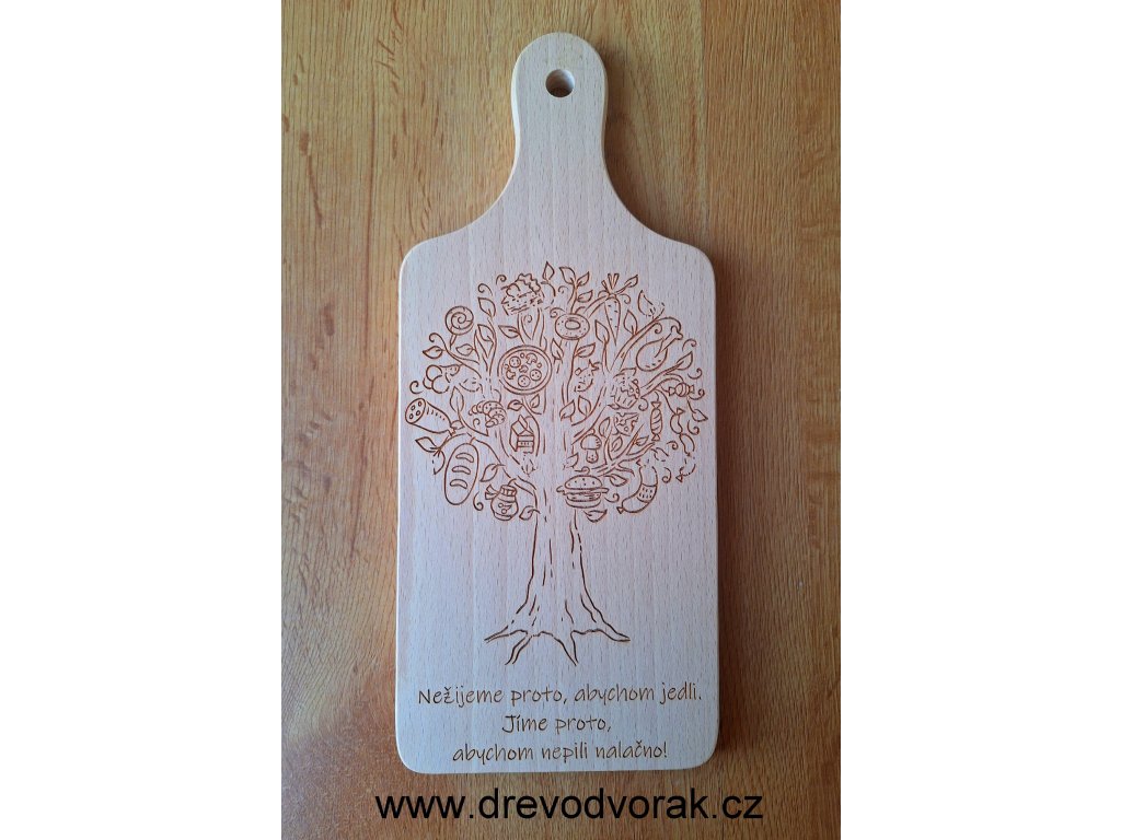 Vtipný a přitom praktický dárek. Prkénko s nápisem Nežijeme proto, abychom jedli. Jíme proto, abychom nepili nalačno.