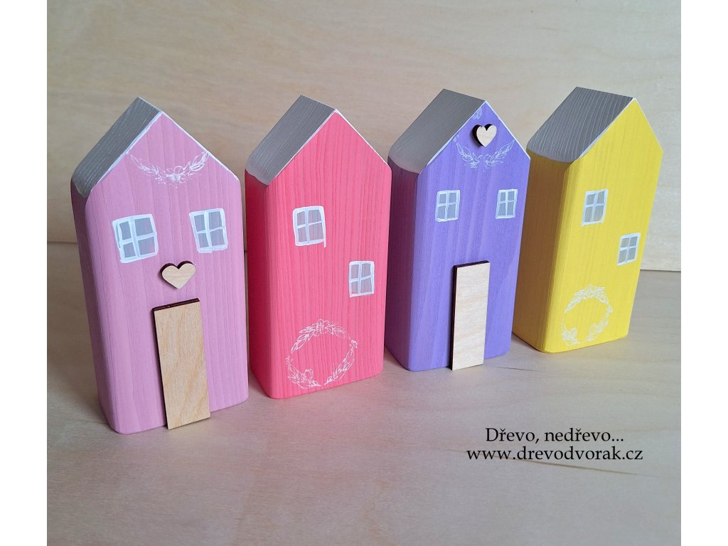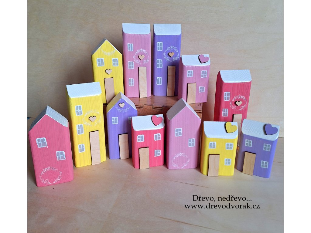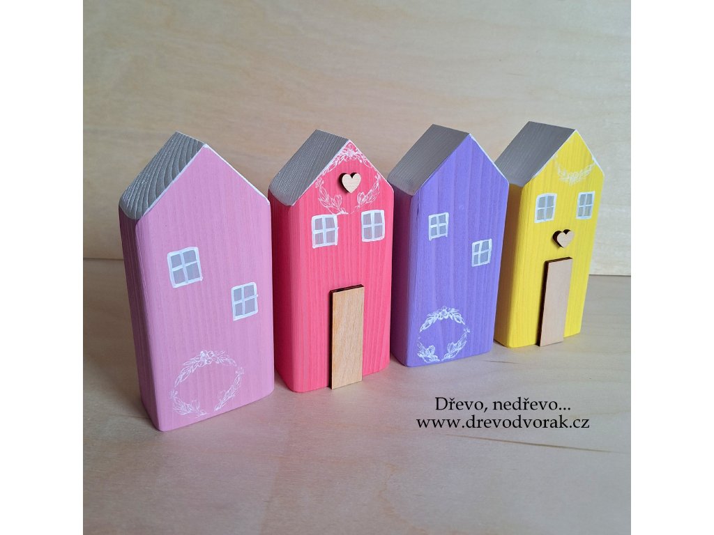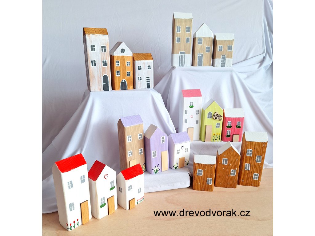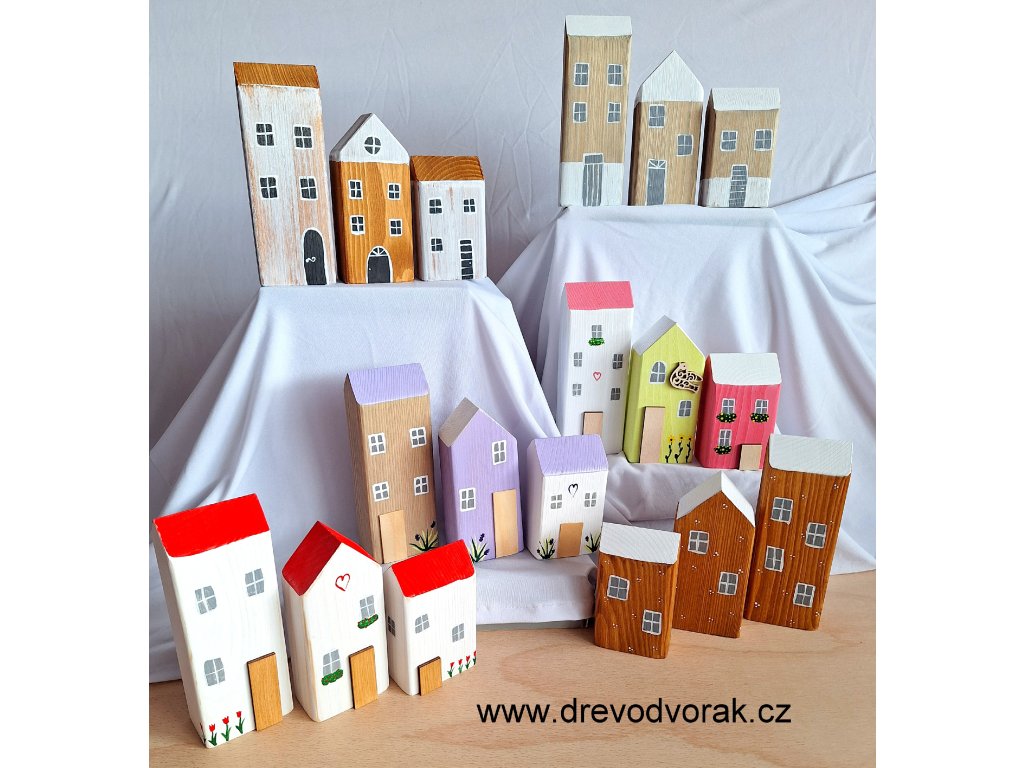 Ručně malované domečky vyrábíme ze smrkových hranolů o rozměru 6 x 4 cm. Vybrat si můžete jednotlivé domečky a sestavit si originální vesničku, nebo se potěšit jedním domečkem.