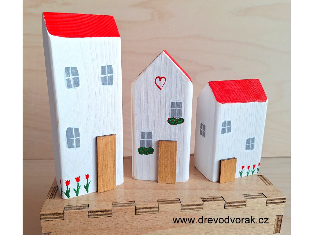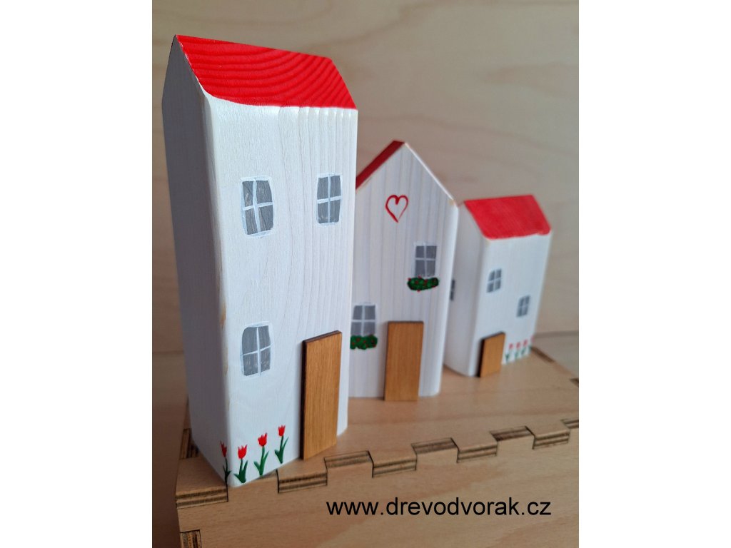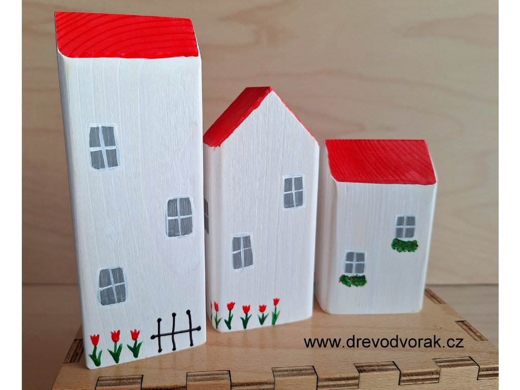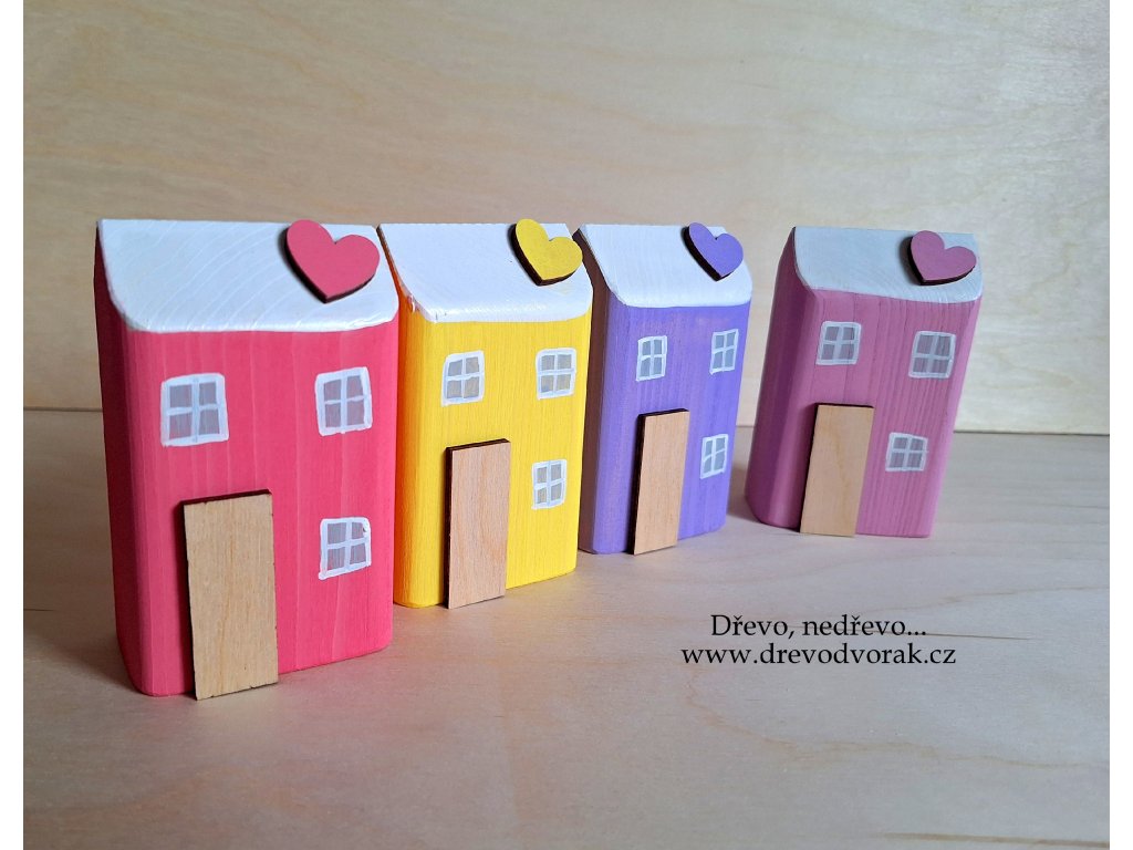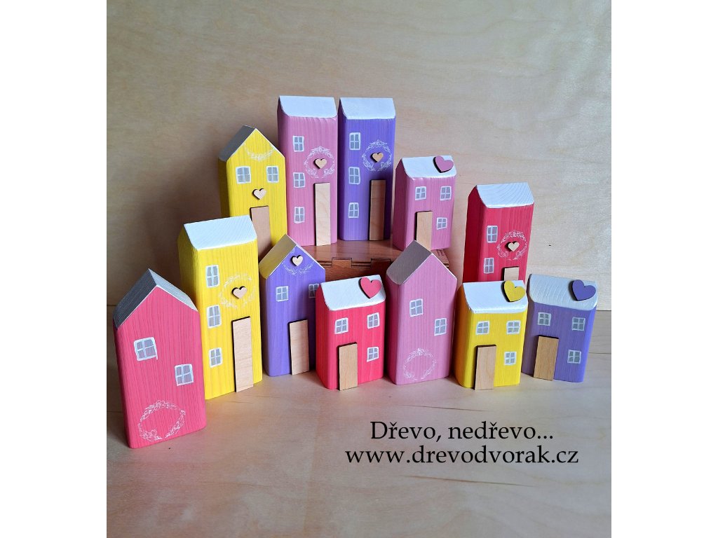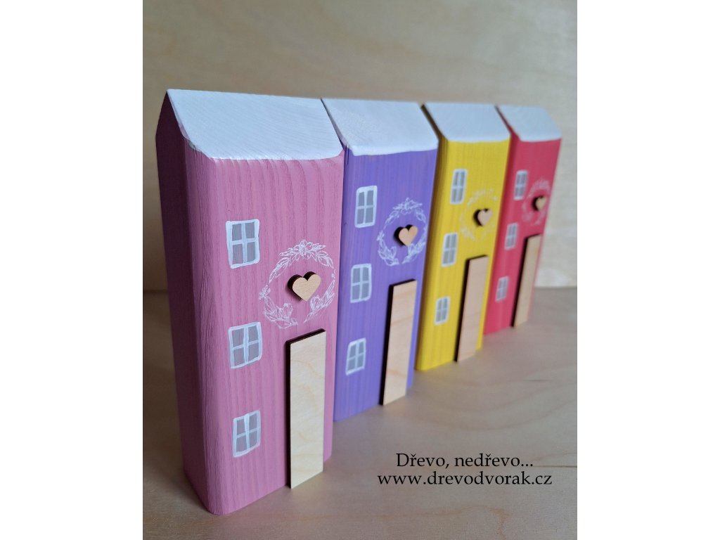 Ručně malované domečky vyrábíme ze smrkových hranolů o rozměru 6 x 4 cm. Vybrat si můžete jednotlivé domečky a sestavit si originální vesničku, nebo se potěšit jedním domečkem.
